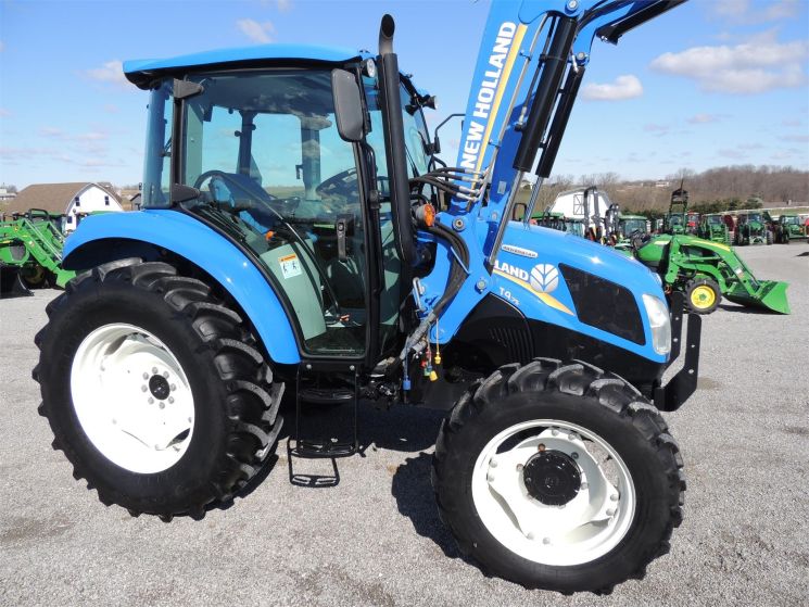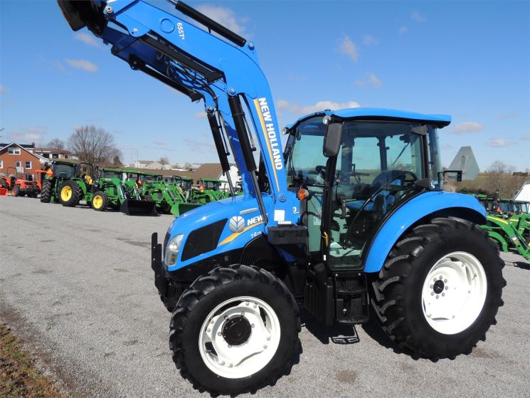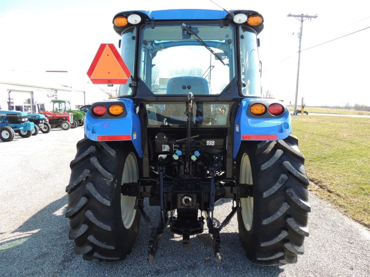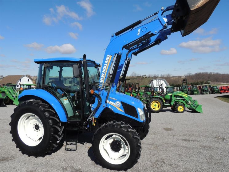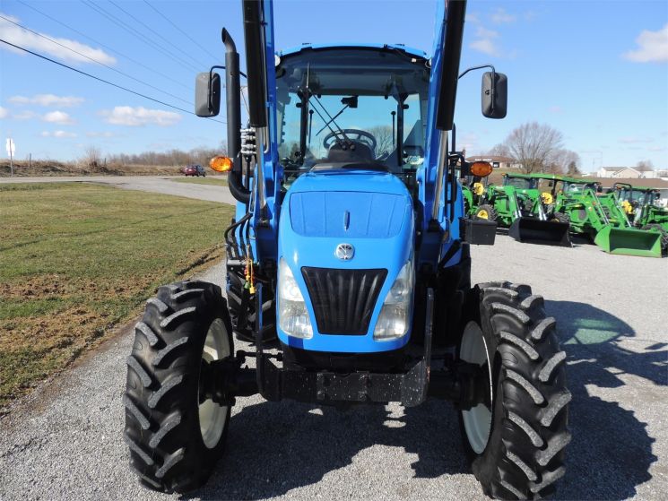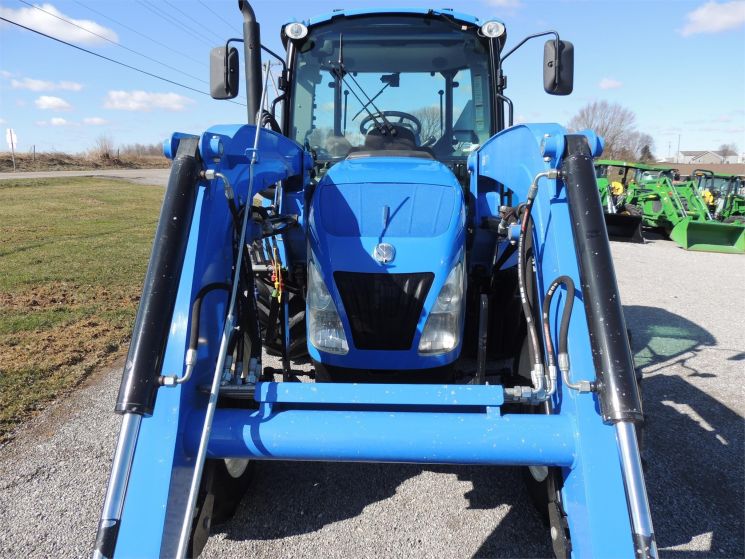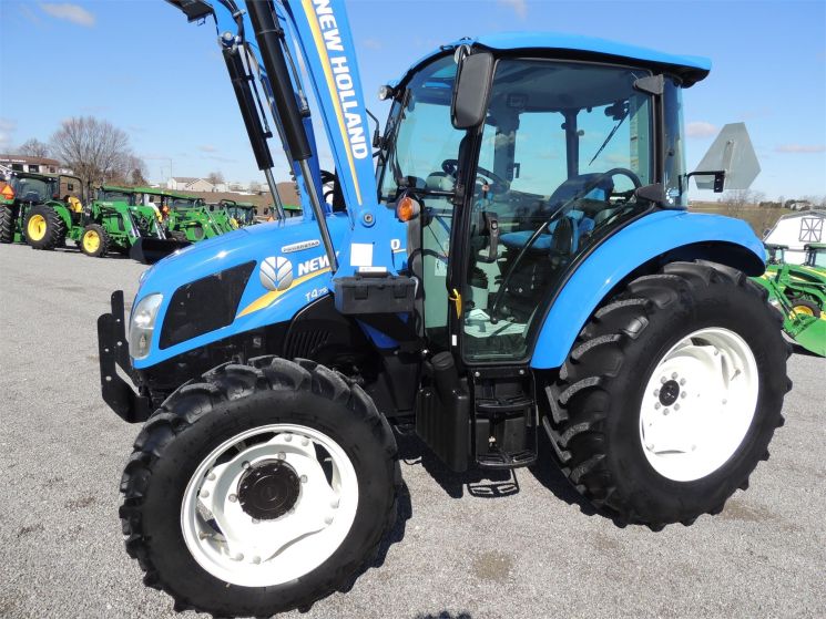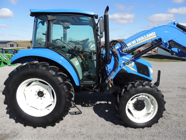 Specifications: 2014 New Holland T4.75 Tractor Drive: MFWD HP: 74 Hours: 220 Excellent Low Hour Tractor with Cab & Loader, Power Shuttle, 2 Rear Hyds, Radial Tires, Sun Roof in Cab, New Holland T4.75 Powerstar -4x4 -Cab, Heat, AC -220 Hours -74 Engine Hp -65 PTO Hp -4 Cylinder Diesel w/Turbo -No DEF Required -Engine Pre-Heater -w/NH 655TL Quick Attach Loader -Factory Joystick -Grill Guard -6' Quick Attach Bucket -Skid Steer Carrier -12/12 Synchronized Gear Transmission -Power Reverser -Power Steering -Differential Lock -540 PTO -2 Rear Hyds -Deluxe Telescopic 3 Point Arms -Top Link -Stabilizer Bars -Galaxy Radial Tires -16.9R30 Rear Tires @ 90% -11.2R24 Front Tires @ 90% -Rear Tires are Loaded -2 Exterior Mirrors -2 Entry Doors -Front & Rear Work Lights on Cab -Corner Post Exhaust -Front & Rear Wiper -Visibility Roof in Cab (Tilts Open) -Deluxe Air Ride Seat -Buddy Seat -Tilt Wheel -Hand & Foot Throttle -Radio -Cup Holder -Sun Visor -Excellent Condition!