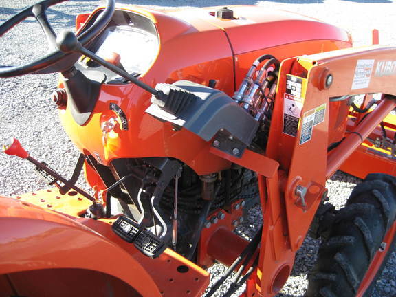 Specifications: - 2016 Kubota L4701 Tractor - Drive: MFWD - Hours: 330 - Configuration: Standard - Cab: No Cab - Transmission: Syncro - Guidance-ready: No - Guidance Receiver: No - Guidance Display: No - Front Axle: MFWD - Rear PTO: 540 - Tire Width: Mid - Loader: Yes - LA765 NSL LOADER - 2 FUNCTION WITH SKID STEER BRACKETS - CANOPY - DRAWBAR - BUCKET - SHUTTLE - FOOT THROTTLE - JOYSTICK - R1 TIRES OPEN, MFWD, R1 TIRES, SYNCRO REVERSER, FOOT THROTTLE, CANOPY, 2 FUNCTION NSL LA765 LOADER, SKID STEER BRACKETS, BUCKET, CLEAN TRACTOR